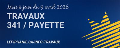 Le ministère des Transports et de la Mobilité durable vous informe que les travaux de réaménagement de l’intersection de la route 341 et de la rue Payette, réalisés en collaboration avec la Ville de L’Épiphanie, débuteront le 12 avril prochain, et devraient durer sept mois.